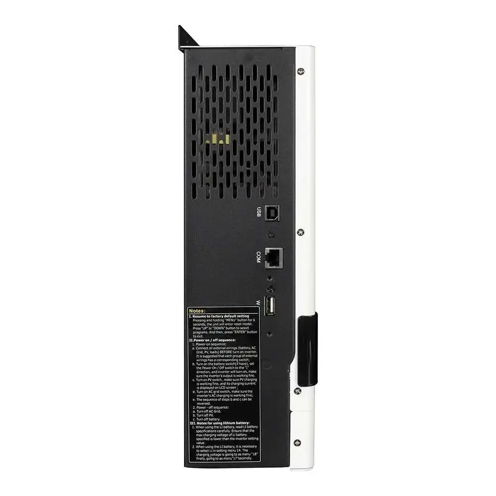 Пристрій оснащений вбудованим MPPT-контролером заряду на 60 А та AC-зарядним пристроєм на 20 А, що дозволяє ефективно поєднувати роботу від сонячних панелей, електромережі та акумулятора. Інтелектуальні алгоритми заряджання подовжують ресурс батарей.