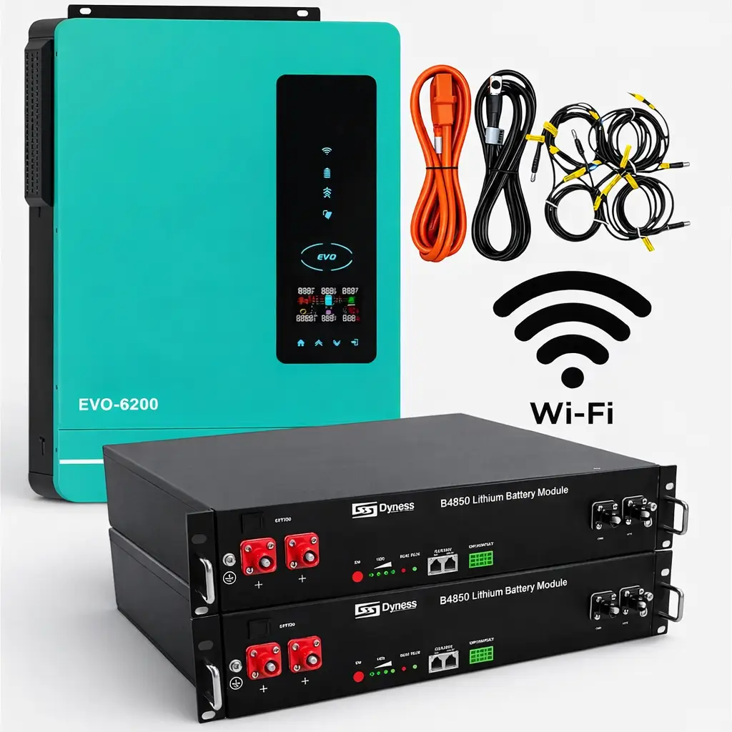 Готове рішення для автономного та резервного електроживлення під час відключень світла. Комплект поєднує гібридний інвертор Anern AN-SCI-EVO-6200 та два акумуляторні блоки Dyness B4850 (LiFePO₄), забезпечуючи стабільну, безпечну та масштабовану систему живлення для дому, офісу або сонячної електростанції.