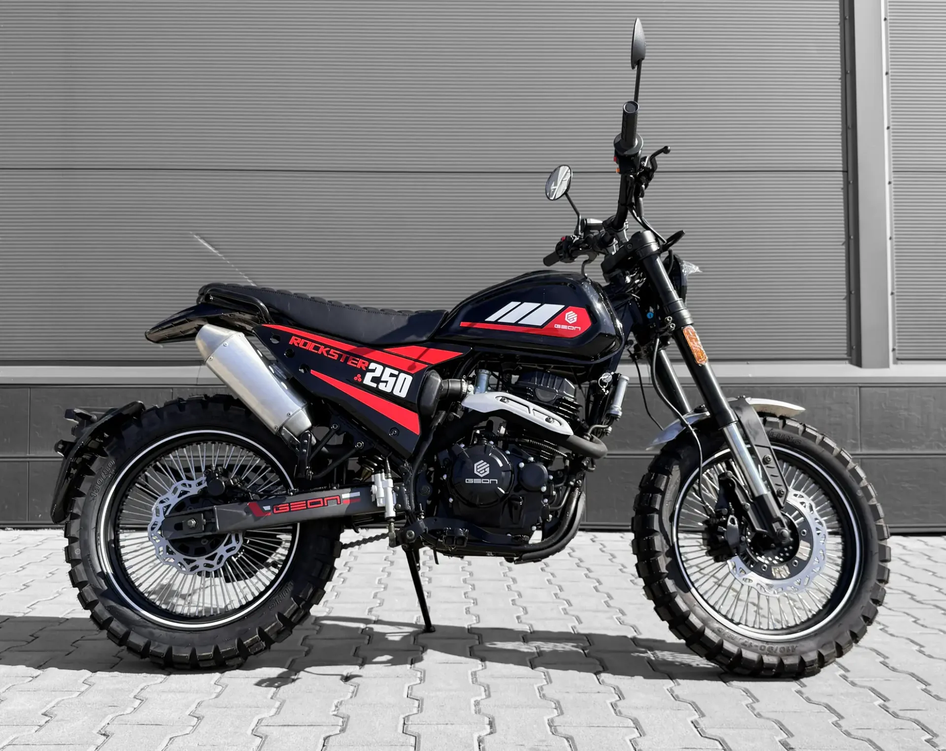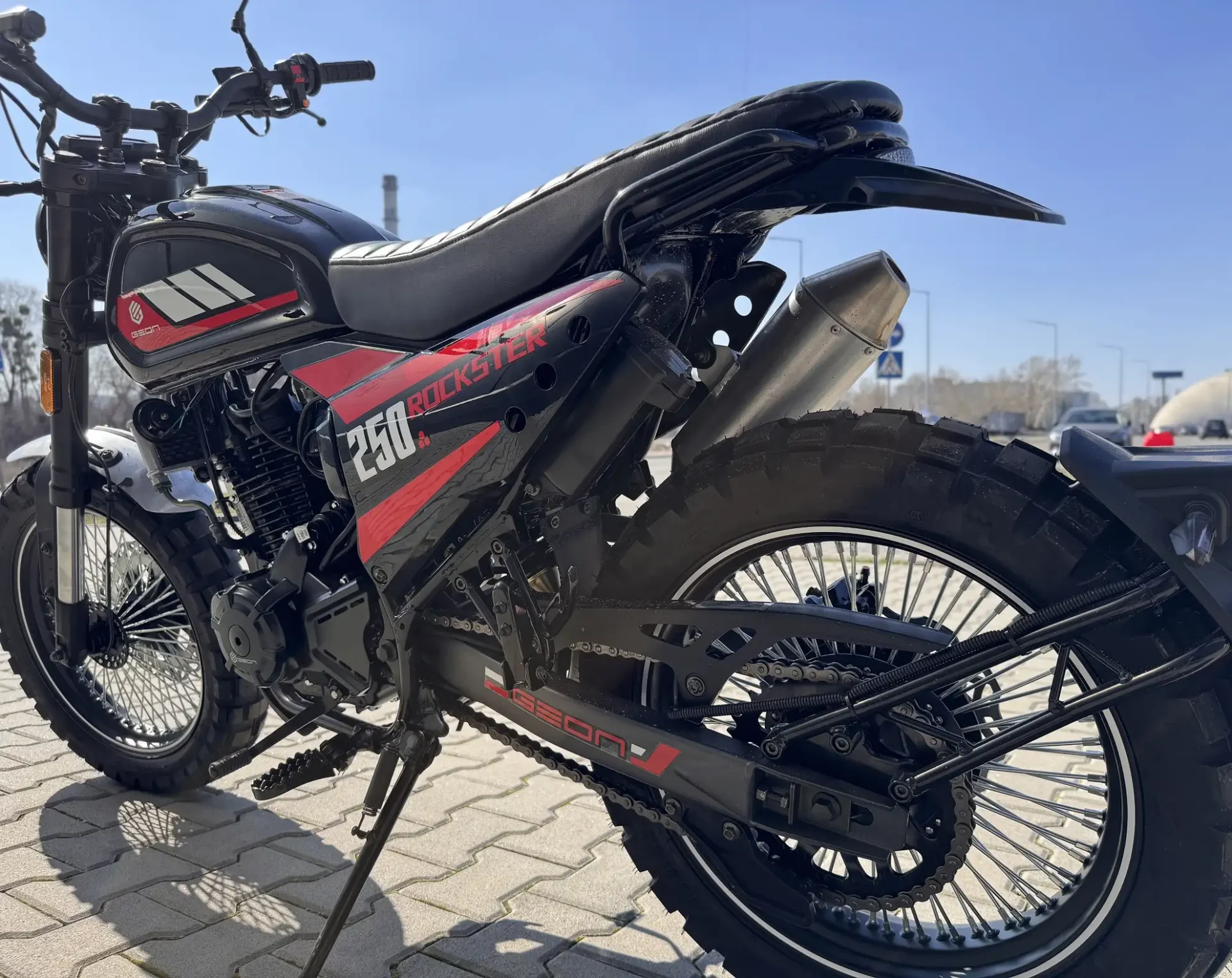 Налаштована під змішаний стиль їзди підвіска включає перевернуту телескопічну вилку спереду і моноамортизатор ззаду, що забезпечує комфортну та контрольовану їзду. Завдяки універсальним шинам 17-го діаметра GEON Rockster 250 On-Road легко долає нерівності, зберігаючи стабільність і зчеплення як на міських вулицях, так і на легкому бездоріжжі. Цифрова LCD-панель приладів, повністю світлодіодна оптика та сучасний дизайн підкреслюють його динамічний характер і готовність до дії.